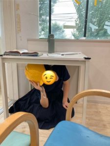 避難訓練は、実際の地震を想定し自由時間にスタッフが机を揺らし地震発生の合図をし、机下に体を収めるように声かけました!!