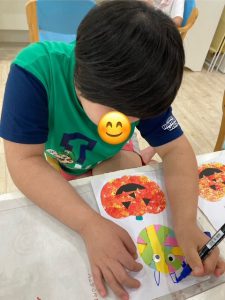 かぼちゃは、絵の具を画用紙につけてポンポンとスタンプしました✨