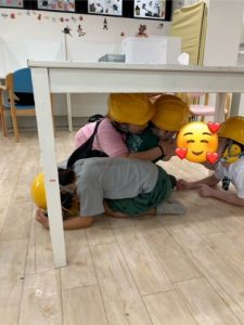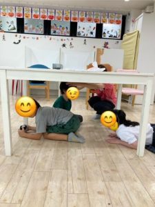 避難訓練は、実際の地震を想定し自由時間にスタッフが机を揺らし地震発生の合図をし、机下に体を収めるように声かけました!!
