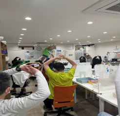 毎朝のラジオ体操は全員が各自席に座ってオリジナルのストレッチを行っています。